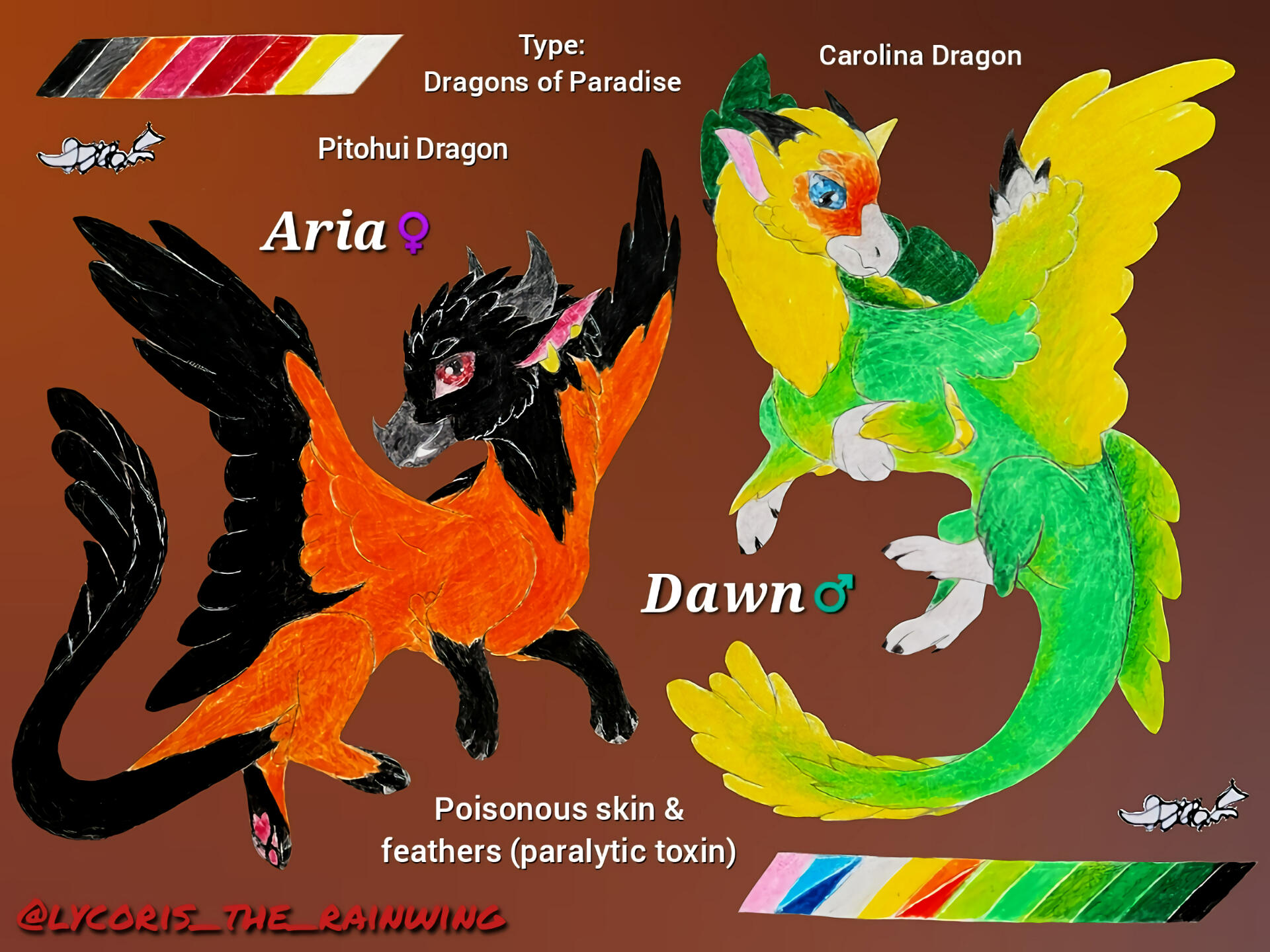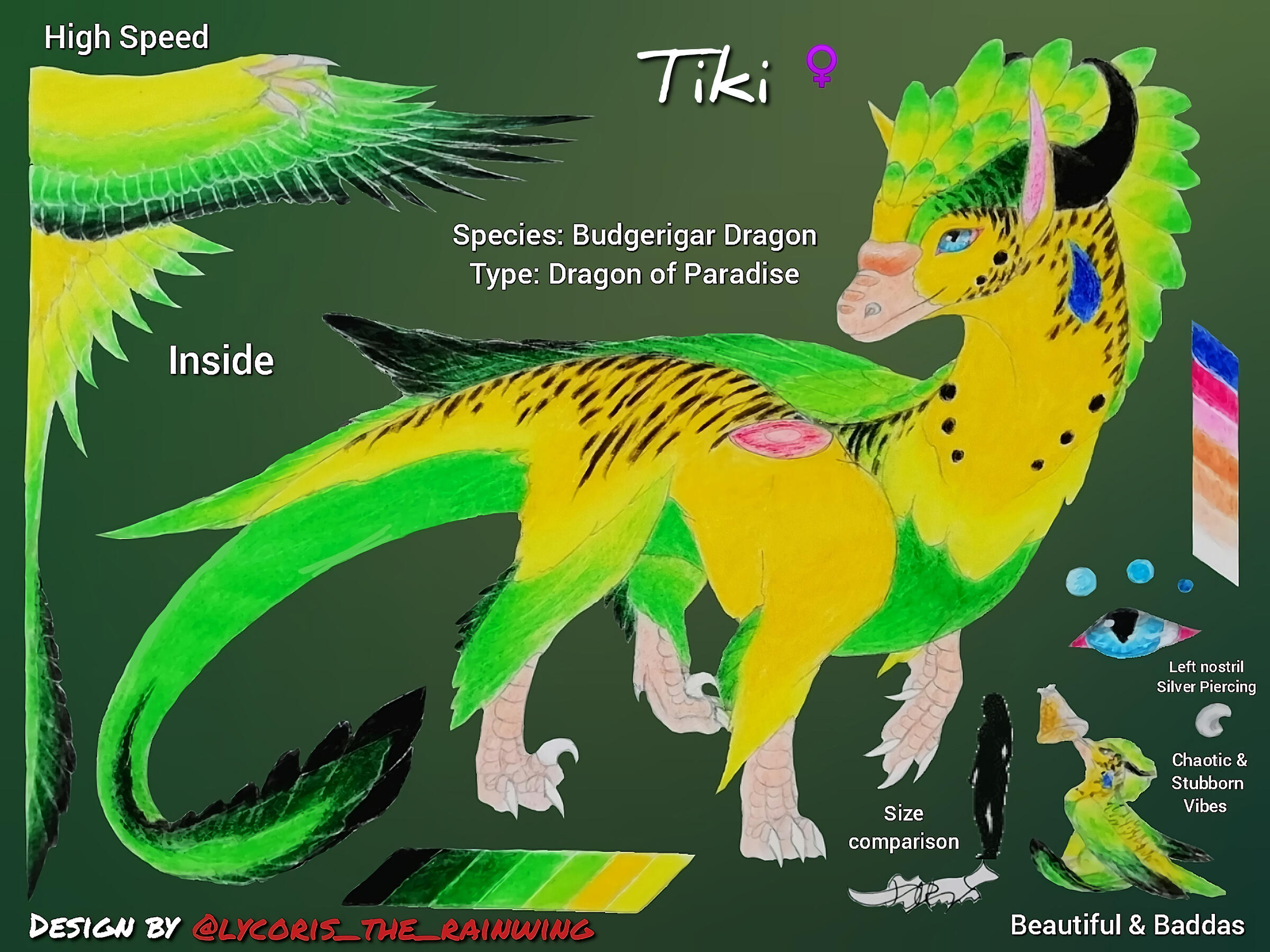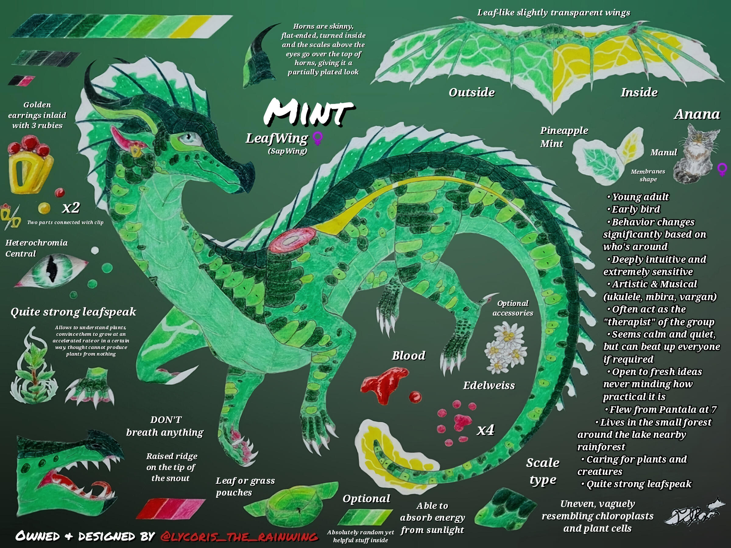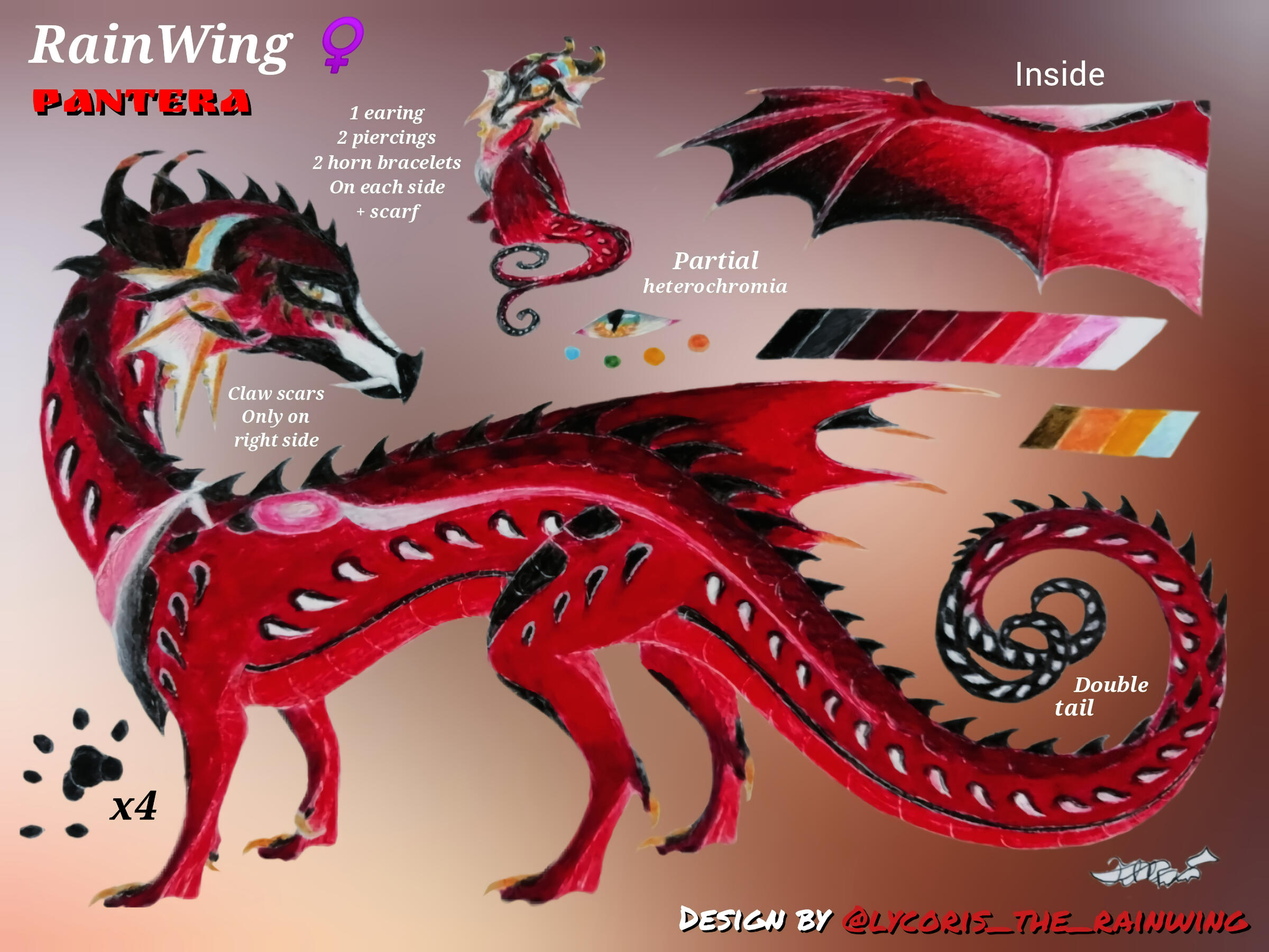 A flat fullbody of already existing OC including name, species, color palette, inside & outside of wing, open jaw, toe beans, scale type, blood and eye shots, plus any needed additional shots (like ability, item, accessory or pet) and all provided info about the design and personality & facts describtion. Requires some kind of pre-existing reference